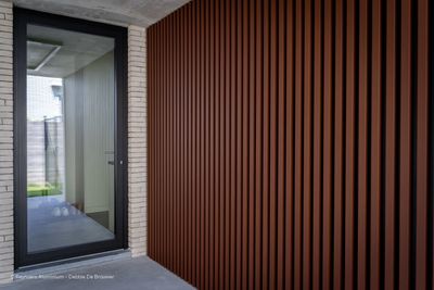 Reynaers Aluminium cladding solutions are available in a variety of designs, colours, and finishes, offering unlimited creative possibilities for your one-of-a-kind home. These aesthetic wall coverings are easy to install and adjust on any wall surface, and can even be applied over glazed areas. A door can also be seamlessly integrated into the Paralline system, creating a flush and concealed appearance for a sleek, modern look.